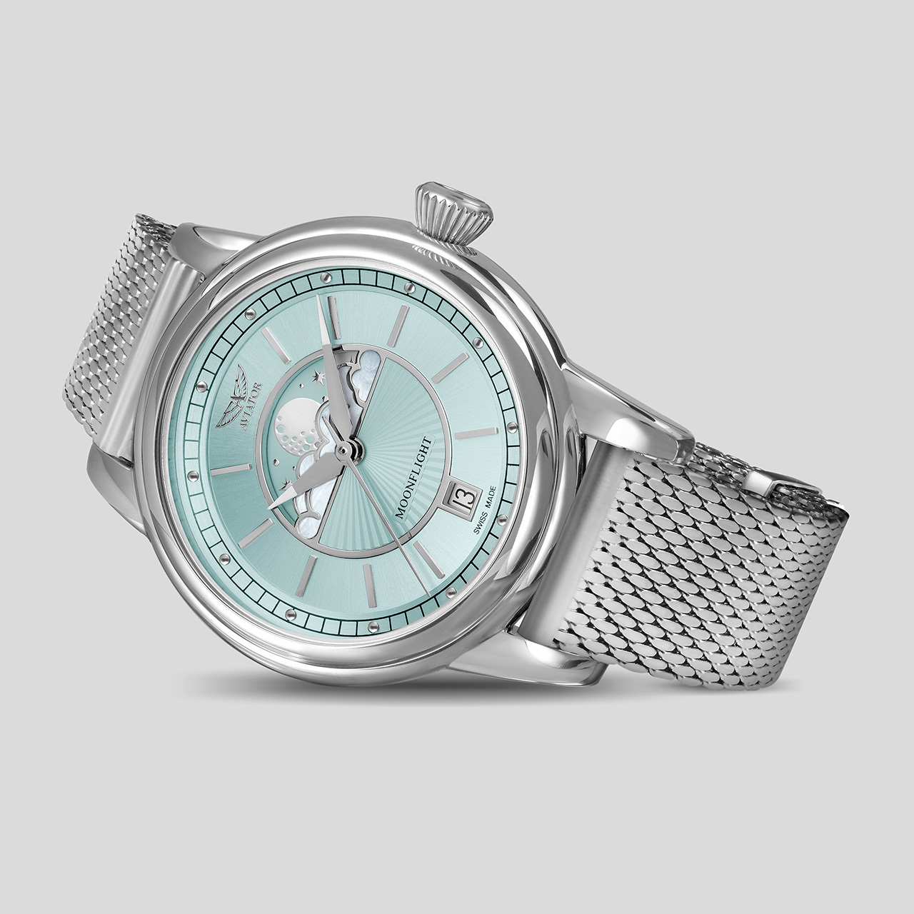 Функции: Центральные часовая, минутная и секундная стрелки, индикация даты в апертуре на отметке “6 часов”, отображение лунных фаз.