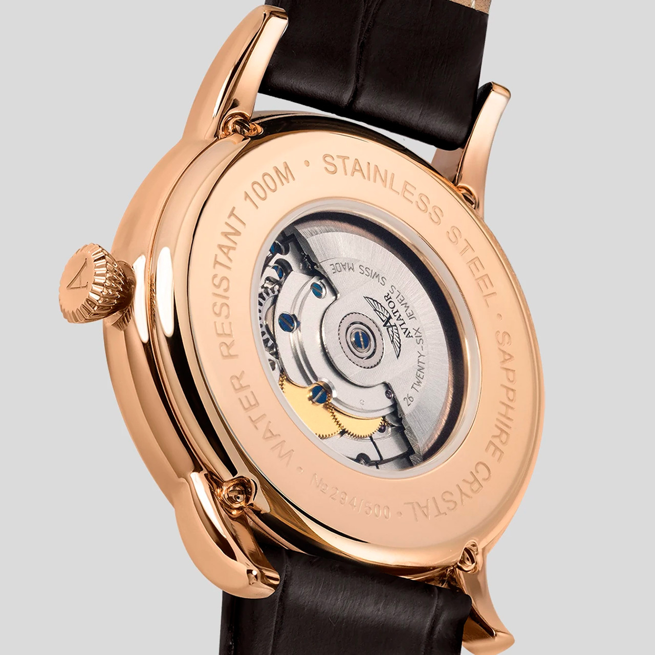 Корпус: Корпус круглой формы выполнен из нержавеющей стали марки 316L с PVD покрытием. Переливающийся бежевого цвета циферблат. Аппликация часовых индексов и печатная разметка в стиле авиационных приборов. Стрелки и часовые метки имеют светящееся в темноте люминесцентное покрытие SuperLuminova. Сапфировое стекло с двусторонним антибликовым покрытием имеет повышенную устойчивость к возникновению царапин. Диаметр: 45 мм. Водозащита: 100 метров.