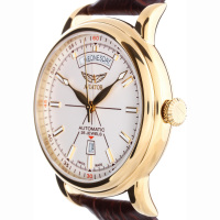 Функции: Центральные часовая, минутная и секундная стрелки, индикация даты и дня недели в апертуре на отметке “6 часов” и большой полукруглой апертуре вверху циферблата.