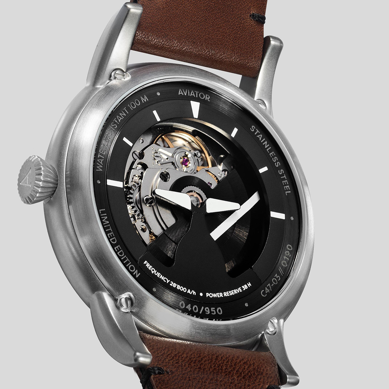 Корпус: Нержавеющая сталь марки 316L.Циферблат в стиле “пилот” черного цвета. Аппликация цифр в ретро-стиле и печатная разметка. «Соборные» стрелки и часовые метки имеют светящееся в темноте люминесцентное покрытие SuperLuminova. Сапфировое стекло с антибликовым покрытием. Переводная коронка с двойным уплотнителем для дополнительной защиты. Задняя крышка с прозрачным окном из сапфирового стекла имеет винтовое соединение с корпусом. В оформлении задней крышки использована стилизация под авиагоризонт. Метки на крышке корпуса и оформление ротора автоподзавода имитируют один из самых важных приборов из кабины самолета Douglas Dakota C-47, который контролирует положение самолета относительно поверхности Земли. Водонепроницаемость 100 метров. Диаметр 45 мм.