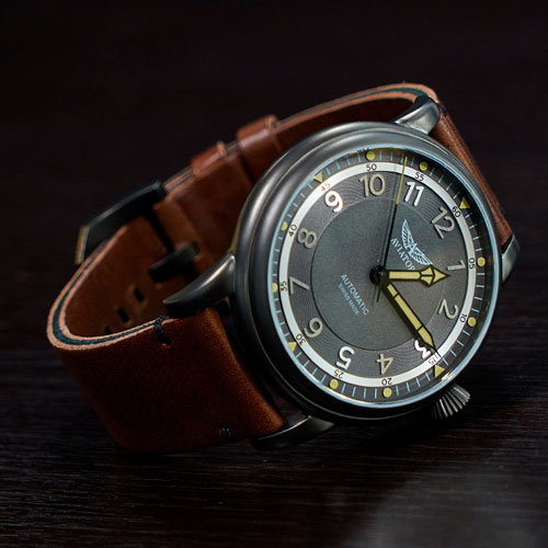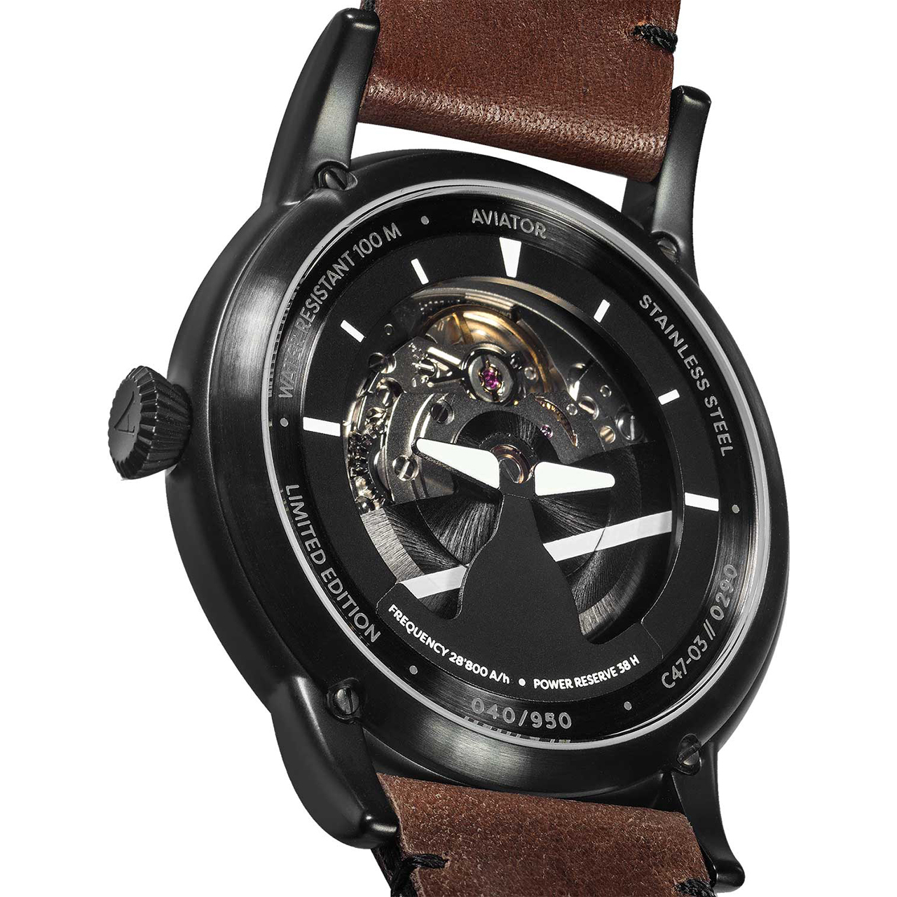 Корпус: Нержавеющая сталь марки 316L с PVD покрытием чёрного цвета. Циферблат в стиле “пилот” черного цвета. Аппликация цифр в ретро-стиле и печатная разметка. «Соборные» стрелки и часовые метки имеют светящееся в темноте люминесцентное покрытие SuperLuminova. Сапфировое стекло с антибликовым покрытием. Переводная коронка с двойным уплотнителем для дополнительной защиты. Задняя крышка с прозрачным окном из сапфирового стекла имеет винтовое соединение с корпусом. Прозрачная задняя крышка украшена имитацией функции контроля управления хвоста самолета. Ротор механизма указывает на градусы, как в авиационном приборе триммер. Водонепроницаемость 100 метров. Диаметр 45 мм.