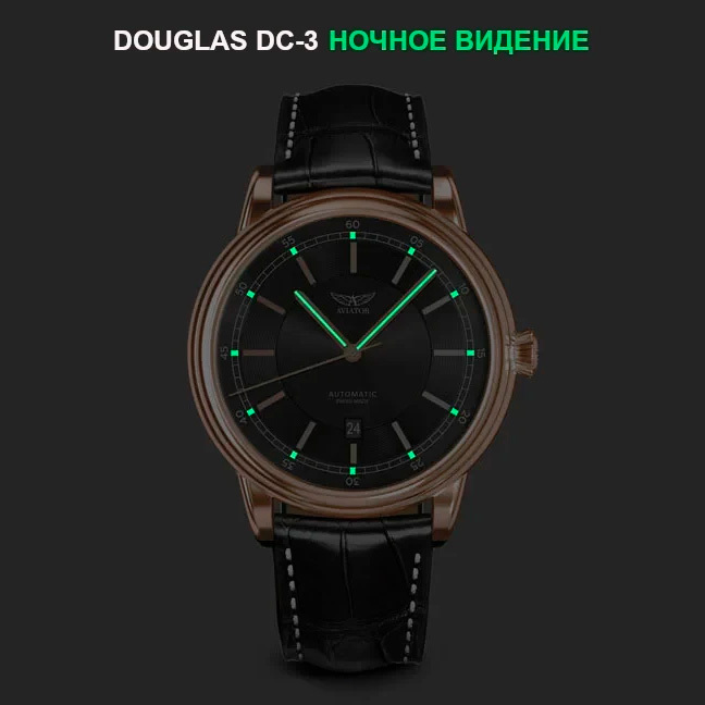 Корпус: Нержавеющая сталь марки 316L с розовым PVD покрытием. Объемный циферблат чёрного цвета с различной финишной обработкой: в центральной части шлифовка в стиле «солнечные лучи», окруженная гильошированием в виде тонких концентрических линий. Стрелки и часовые индексы покрыты люминесцентным составом SuperLuminova. Сапфировое стекло с антибликовым покрытием. Переводная коронка с двойным уплотнителем для дополнительной защиты от попадания воды внутрь корпуса. Задняя крышка с прозрачным окном из сапфирового стекла имеет винтовое соединение с корпусом. В оформлении задней крышки использована стилизация под один из инструментов управления из кабины самолета Douglas DC-3. Гравировка с градусами на крышке корпуса и стрелка на роторе автоподзавода имитируют функцию угла перекладки руля, которая контролирует положение передней и задней частей самолета. Водонепроницаемость 100 метров. Диаметр 45 мм.