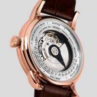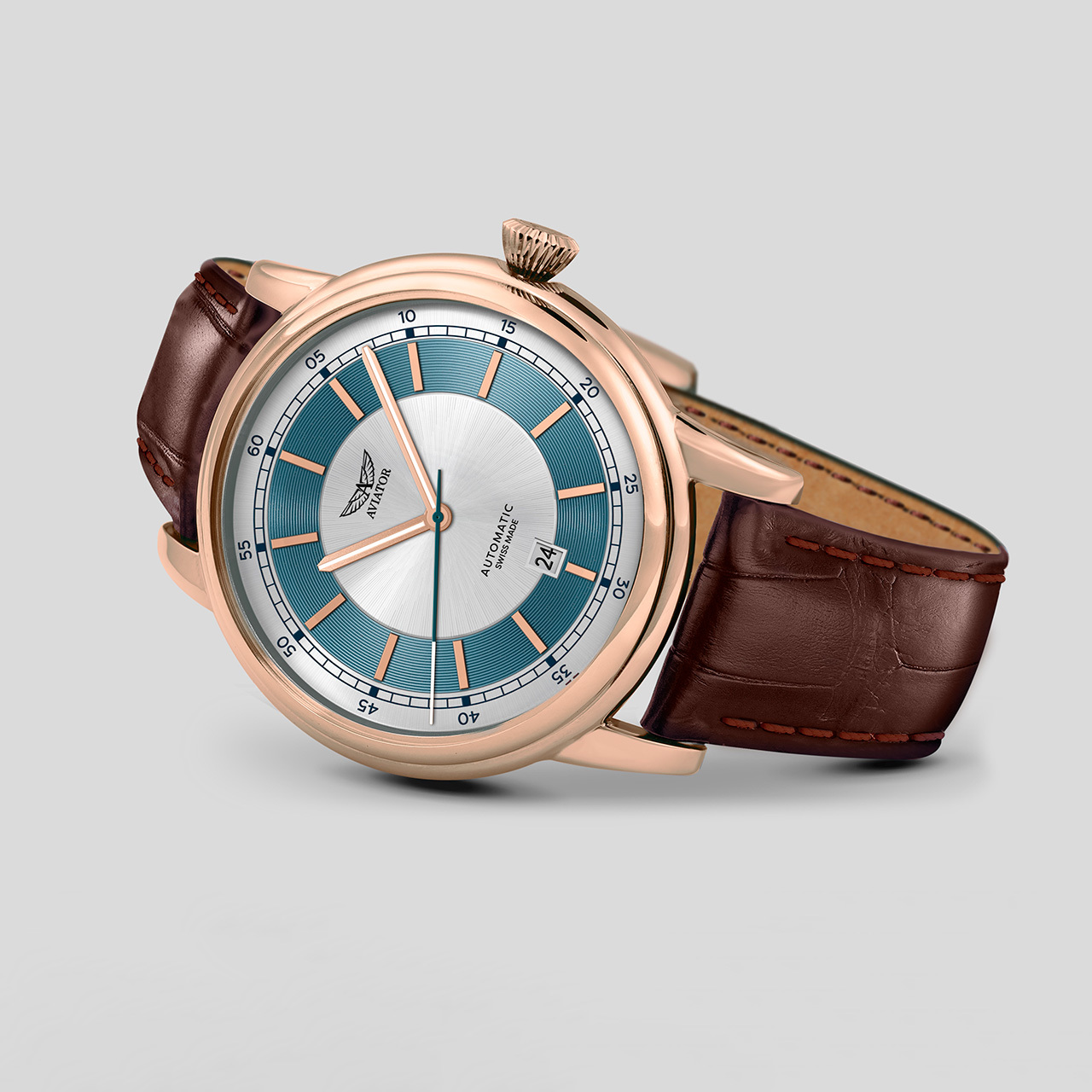 Корпус: Корпус круглой формы выполнен из нержавеющей стали марки 316L с PVD покрытием, цвета розового золота. Циферблат выполнен по технологии sun-ray (солнечные лучи). Часовые метки выполнены в виде штрихов. Стрелки и метки с покрытием SuperLuminova. Сапфировое стекло с двусторонним антибликовым покрытием. Прозрачная задняя крышка украшена имитацией функции контроля управления хвоста самолета. Ротор механизма указывает на градусы, как в авиационном приборе триммер. Диаметр 45 мм, толщина 11,1 мм. Водозащита 100 метров.