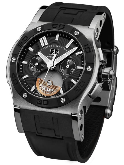 Новинка «Abyss 47mm Chronograph & Grande Date» выделяется своей массивностью и выразительной формой, её водонепроницаемость составляет 3 атм. (30 м.). Модель предлагается на каучуковом ремешке чёрного цвета с фирменной раскладывающейся застёжкой «Hysek».