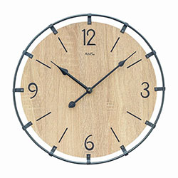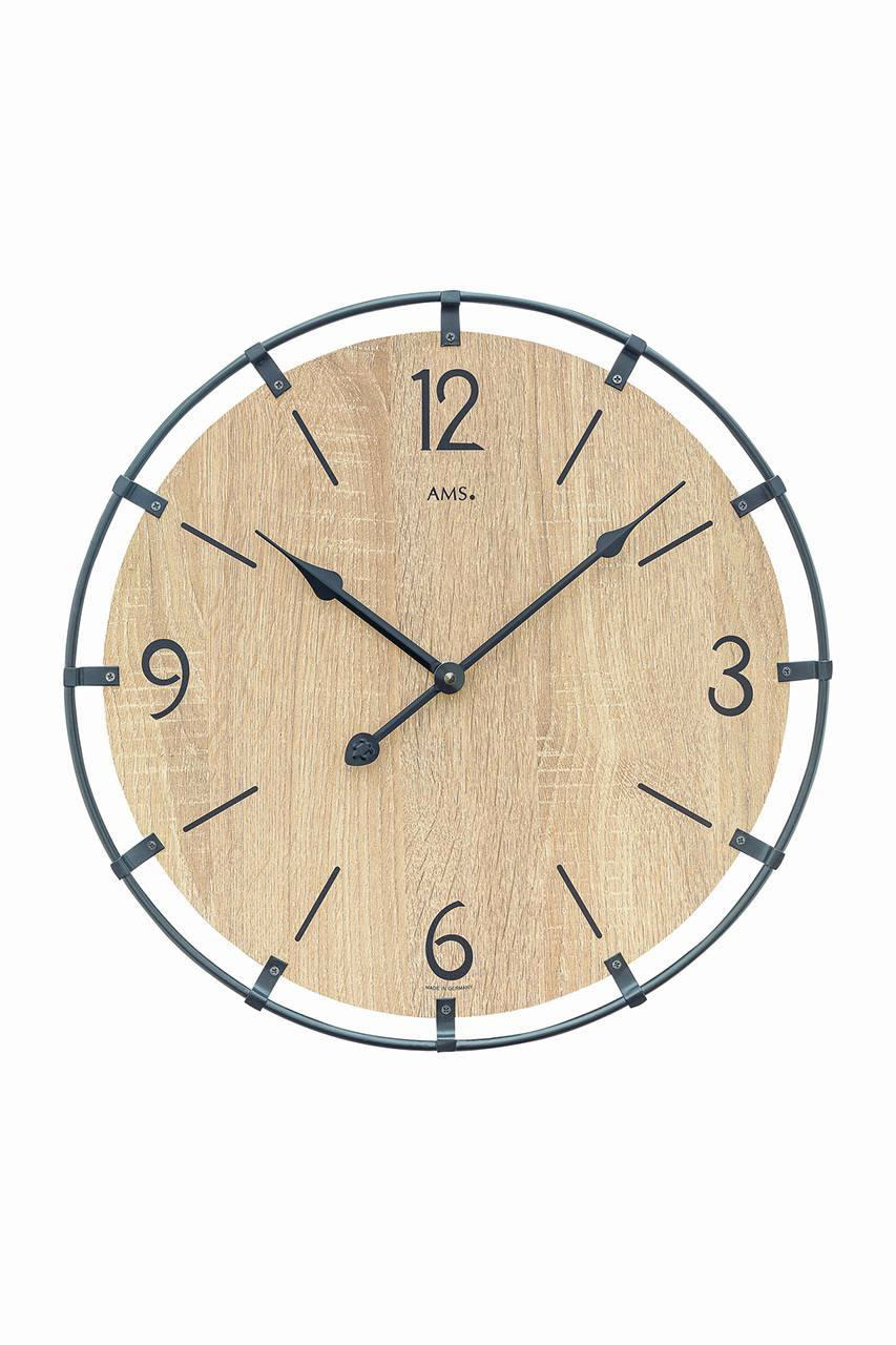 - AMS W 9616 SO – Лаконичность и природная гармония. Эта модель – воплощение современного минимализма. Черное металлическое кольцо вокруг циферблата под дуб Sonoma с ним, создавая ощущение легкости и простоты. Четкие арабские цифры и метки обеспечивают отличную читаемость, а бесшумный кварцевый механизм гарантирует тишину и спокойствие. Диаметр 40 см делает эти часы компактными, удобными и гармоничными для гостиной, кухни или офиса в стиле лофт или сканди. Этот вариант идеален для поклонников современного интерьера.