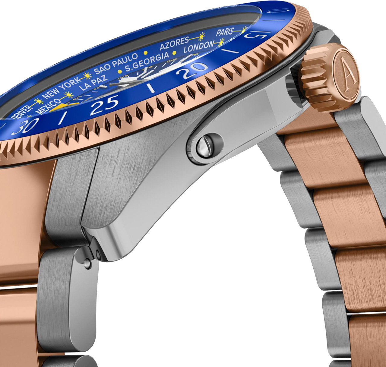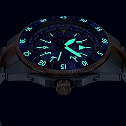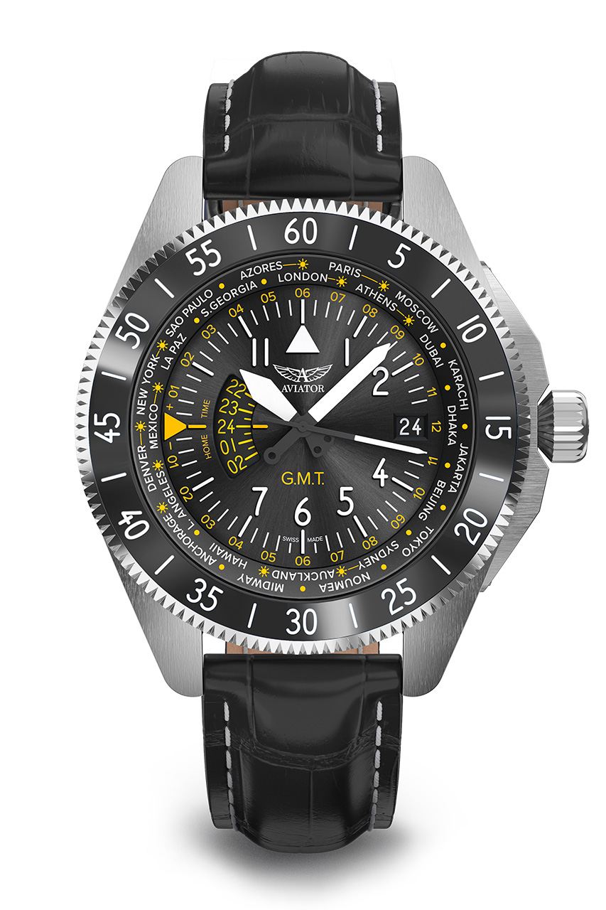 Откройте для себя свежий взгляд на время в любой точке мира вместе с новой моделью Aviator Airacobra Auto. Эта модель оснащена двумя дисплеями, где дисплей второй часовой зоны работает в паре с инновационным вращающемся безелем. Это позволяет владельцу без всяких усилий отслеживать мировое время во всех 24 часовых поясах мира.