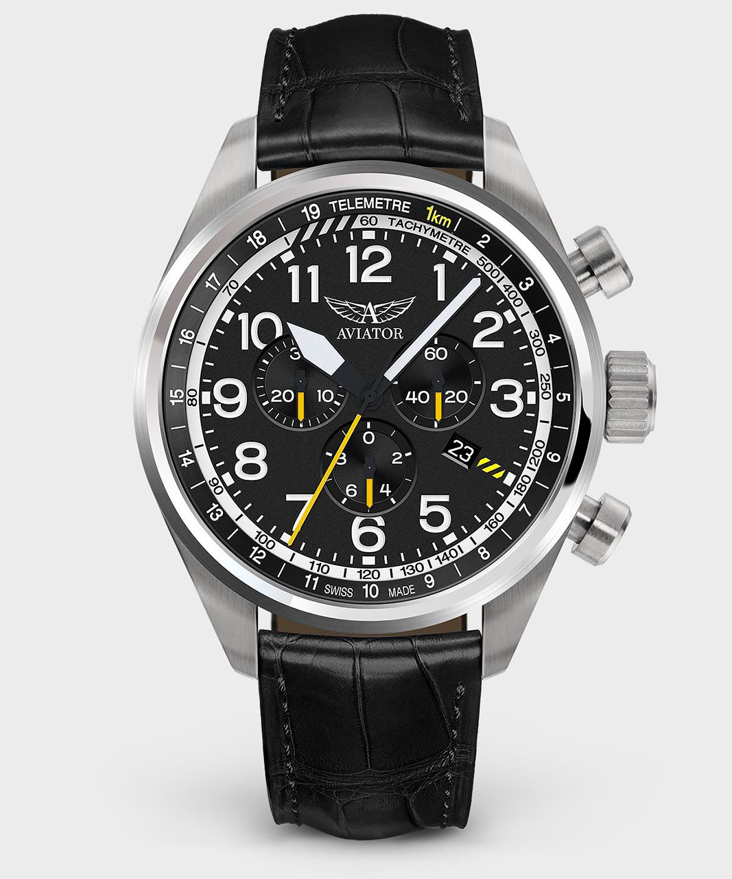 Успех пехотных операций во время Второй мировой войны стал возможен благодаря поддержке войск «Аэрокобры» с неба. Точно как этот истребитель сыграл важную роль для пилотов и для миссии, так и часы AVIATOR Airacobra P45 Chrono обеспечивают такую же безупречную надежность с инструментальным видом, вдохновленным этим почетным героем войны. Часы AVIATOR Airacobra P45 Chrono, изготовленные из высококачественных материалов, сочетают в себе военную точность и классический внешний вид. Высококонтрастные стрелки и цифры свидетельствуют о классическом кокпите, которые сочетаются с неподвластным времени корпусом и роскошным ремешком в стиле аллигатора. Это союз непоколебимой надежности и страсти к увековечиванию истории авиации, который заключен в каждом авиационном часе.