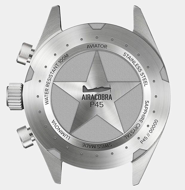 Поверните эти часы, и история, стоящая за этой моделью, раскроет их авиационный дизайн. Задняя часть корпуса притягивает прямые сигналы от самолета Airacobra – от четырех винтов по периметру до тонких технических описаний. А значок самолета Airacobra, выгравированный на задней стороне корпуса, еще больше отдает дань уважения этому героическому истребителю Второй мировой войны.