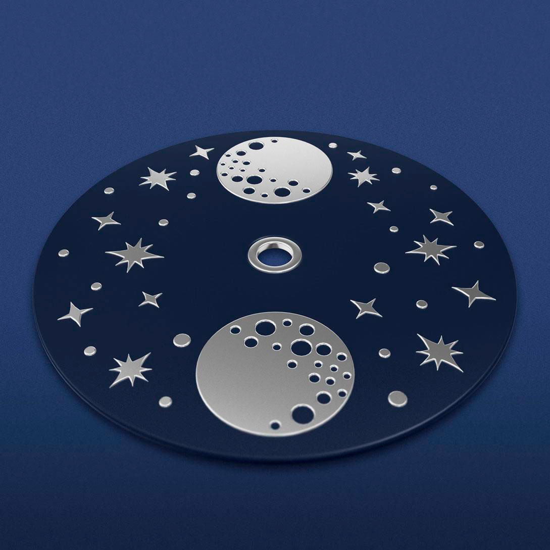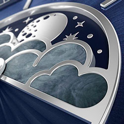 Интрига кроется в деталях. Облака украшены настоящим перламутром и служат отверстием для указателей фаз Луны. Это тонкое напоминание о простой красоте и классическом виде нити жемчуга той эпохи добавляет винтажный шарм этому вневременному аксессуару. С его игривыми переливами потрясающие цветовые отражения воссоздают впечатление лунного света. Украдкой взгляните на лунный свет, флиртующий с облаками и играющий с отражениями. Они так же реалистичны, как звездное ночное небо.