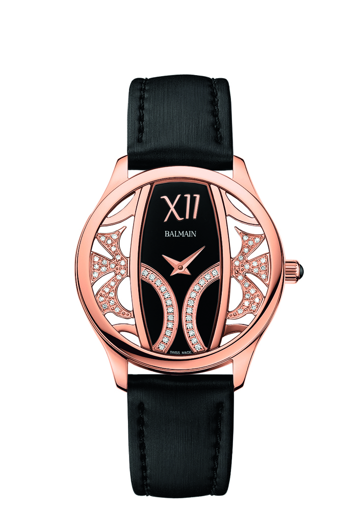 Циферблат часов представляет собой ажурную скелетонизированную лицевую панель, украшенную арабесками в современном стиле. Его центральная часть, защищённая прозрачным сапфировым стеклом и выделенная выгнутыми линиями, соединяющимися с окружностью корпуса, представлена в трёх вариантах: серебристый, белый перламутр и полированный чёрный лак. Некоторые модели декорированы 44 алмазами «Wesselton». На циферблате находятся центральные ромбовидные стальные стрелки часов и минут, крупная цифра «XII» и логотип «Balmain». В некоторых версиях все эти элементы могут иметь золотое напыление.