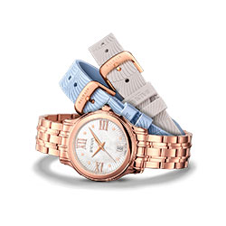 Перламутровые циферблаты всех моделей коллекции Eria Lady Round наполнены духом моря. Три крупные римские цифры образуют систему координат, подобно компасу, направляющему моряков в ночной шторм. Дизайн изысканных каучуковых ремешков погружает в самые глубины царства Нептуна. Удивительные ракушки и коралловые рифы вырисовываются на бледно-голубом, сером, черном или белом фоне. Две модели из линейки Eria Lady Round снабжены металлическими браслетами, которые сочетаются с корпусами из серебристой нержавеющей стали или с PVD-покрытием из розового золота. Для свободного доступа в мир водной стихии модели дополнены практичным сменным ремешком из каучука.