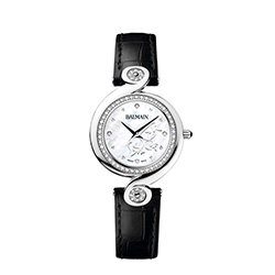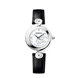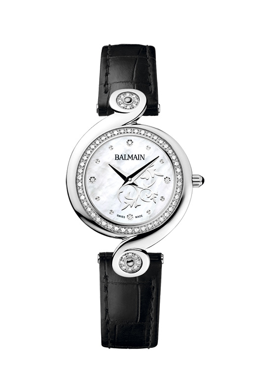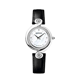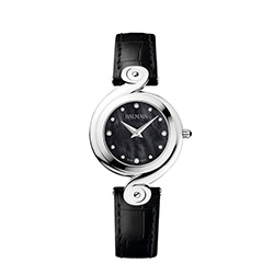 2. Balmain Kerria B4171.32.83 Стальной полированный корпус. Белый перламутровый циферблат с центральными гранёными полированными стальными стрелками часов и минут, с четырьмя бриллиантами в виде условных индексов, с фирменным серебристым узором в форме арабески. Чёрный ремешок из натуральной кожи с полированной стальной застёжкой. |