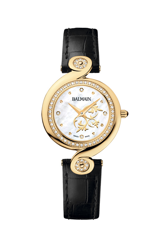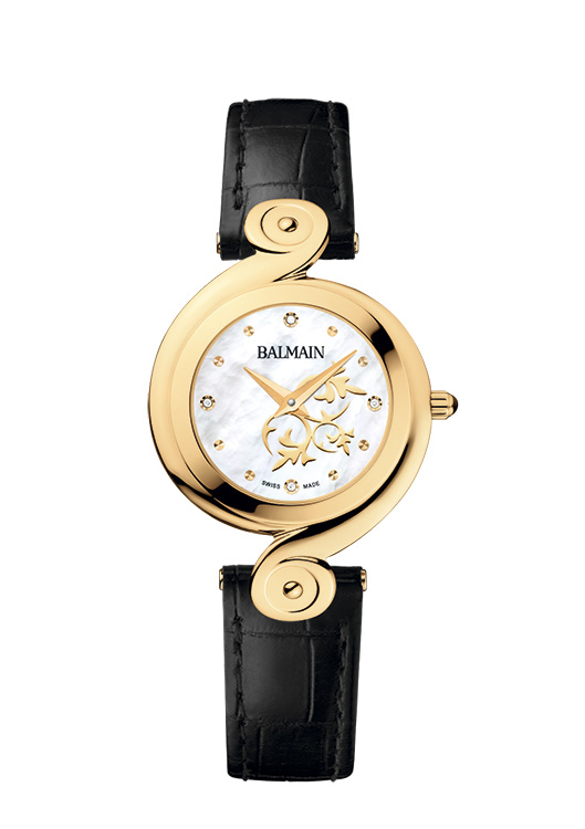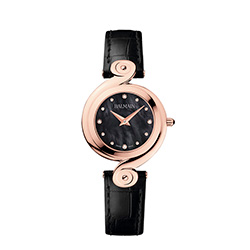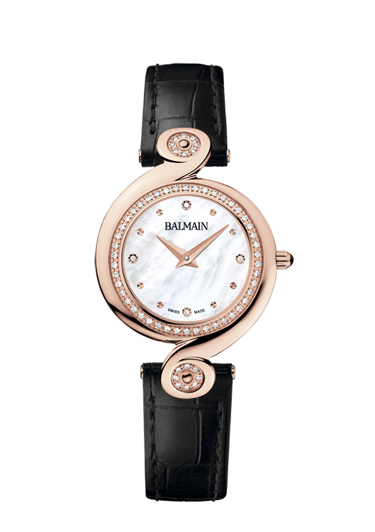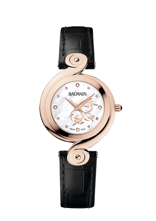 13. Balmain Kerria B4179.32.83 Стальной полированный корпус с розово-золотым PVD-покрытием. Белый перламутровый циферблат с центральными гранёными стальными, с розовой позолотой, стрелками часов и минут, с четырьмя бриллиантами в виде условных индексов, с фирменным розово-золотым узором в форме арабески. Чёрный ремешок из натуральной кожи с застёжкой из стали с розовой позолотой. |