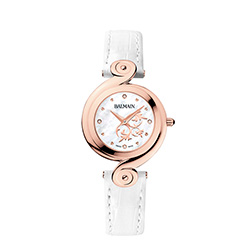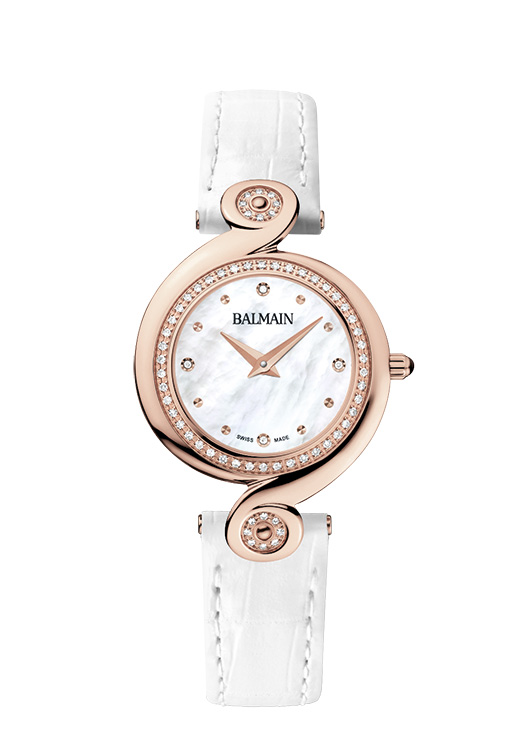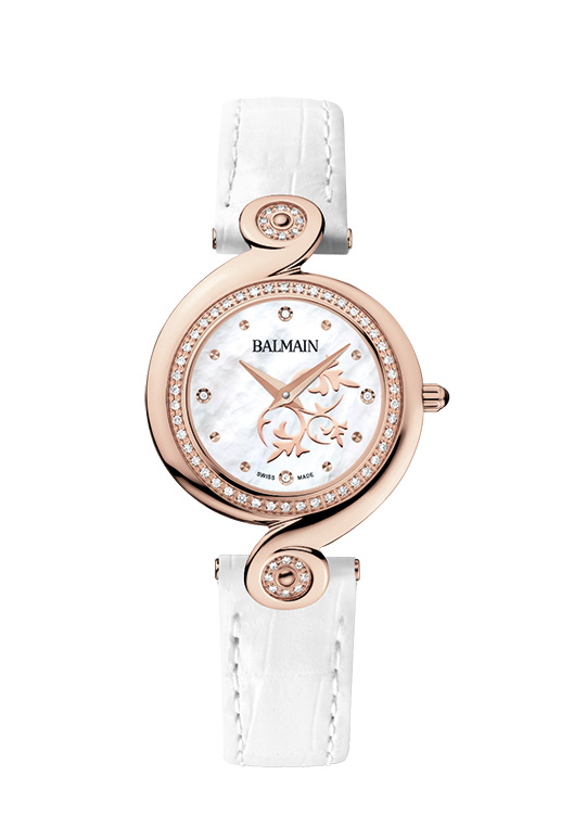 10. Balmain Kerria B4179.22.83 Стальной полированный корпус с розово-золотым PVD-покрытием. Белый перламутровый циферблат с центральными гранёными стальными, с розовой позолотой, стрелками часов и минут, с четырьмя бриллиантами в виде условных индексов, с фирменным розово-золотым узором в форме арабески. Белый ремешок из натуральной кожи с застёжкой из стали с розовой позолотой. |