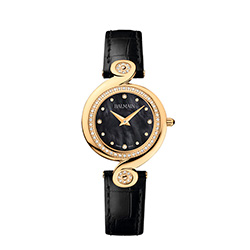 8. Balmain Kerria B4170.32.83 Стальной полированный корпус с жёлто-золотым PVD-покрытием. Белый перламутровый циферблат с центральными гранёными стальными, с жёлтой позолотой, стрелками часов и минут, с четырьмя бриллиантами в виде условных индексов, с фирменным жёлто-золотым узором в форме арабески. Чёрный ремешок из натуральной кожи с застёжкой из стали с жёлтой позолотой. |