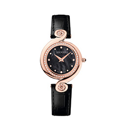 22. Balmain Kerria B4174.32.86 Стальной полированный корпус с розово-золотым PVD-покрытием и шестьюдесятью двумя бриллиантами. Белый перламутровый циферблат с центральными гранёными стальными, с розовой позолотой, стрелками часов и минут, с четырьмя бриллиантами в виде условных индексов. Чёрный ремешок из натуральной кожи с застёжкой из стали с розовой позолотой. |
