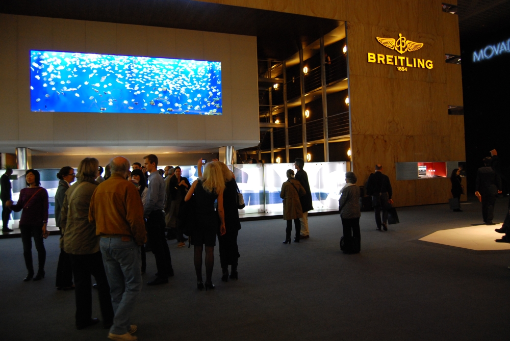 Традиционно многолюдно было у стенда Breitling – они славятся не только самыми веселыми и неожиданными на BASELWORLD вечеринками, но вот уже который год украшают экспозицию огромным аквариумом. Это символ, символизирующий активную работу Breitling в направлении разработки часов с водозащитой. На его конструирование в этот раз ушло порядка трех недель, а сразу после выставки, как мне на вечернем коктейле сказал один из топ-менеджеров бренда, все рыбы будут отвезены и выпущены обратно в океан.