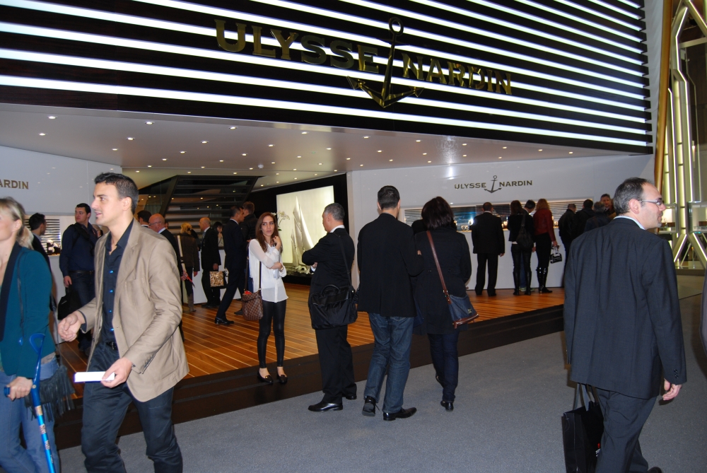 Чуть не прошла мимо стенда Ulysse Nardin. Мануфактура полностью изменила концепцию внутреннего оформления своих корнеров и выставок – вместо привычных темных цветов, появился белый в комбинации с морскими полосками. Кстати, я заметила, что многие двинулись в аналогичную сторону, то есть вместо фирменного бардового или коричневого стали использовать либо чисто белый, либо другие светлые оттенки в оформлении. Наверное, новый тренд – светлое пространство смотрится воздушным, а часовые новинки и механизмы хорошо считываются.