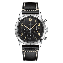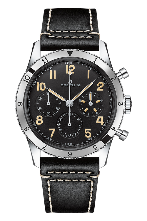 Часы Breitling AVI Ref. 765 1953 Re-Edition доступны с черным кожаным ремешком в винтажном стиле с классической застежкой. Гарантия составляет пять лет.