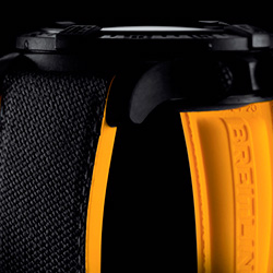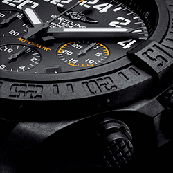 Круглый матово-чёрный корпус нового хронографа «Breitling Avenger Hurricane Automatic», диаметром 50,00 мм и толщиной (высотой) 16,97 мм, изготовлен из очень прочного и лёгкого полимера (более чем в три раза легче титана и почти в шесть раз легче стали) – недавно созданного и запатентованного мануфактурой «Breitling» и названного «Breitlight®». Помимо указанных характеристик, этот инновационный материал обладает высокой термостойкостью и прочностью, он невосприимчив к коррозии, царапинам, деформации и магнитному воздействию, а также, что немаловажно для наручных часов, не вызывает аллергических реакций и «теплее» металла по тактильным ощущениям. Поверх корпуса установлен вращающийся в одном направлении чёрный матовый безель с храповым механизмом*, который удачно гармонирует с изогнутыми проушинами для ремешка. На безеле, помимо выгравированной минутной шкалы, имеются объёмные фирменные метки «15, 30, 45 и 60 минут», которые сделаны в виде выступов, позволяющих легко манипулировать безелем в перчатках. Последняя 60-минутная метка вместо числового обозначения выделена крупной точкой с белым люминесцентным покрытием.