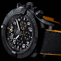 | 1. Breitling Avenger Hurricane XB1210E4/BE89-257S: матовый чёрный корпус из инновационного полимера «Breitlight®»; чёрный циферблат; ремешок «Diver Pro» из жёлтого каучука и высокопрочного текстиля «Military» цвета антрацит с раскладывающейся застёжкой. | |