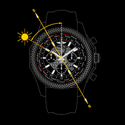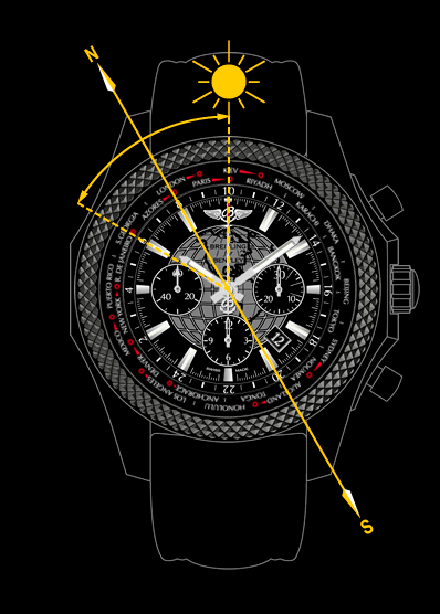 В южном полушарии индекс 12-часовой отметки направляется точно к солнцу. В середине отрезка между местным временем и 12-часовой отметкой на циферблате находится север, юг – в диагонально противоположной стороне циферблата.