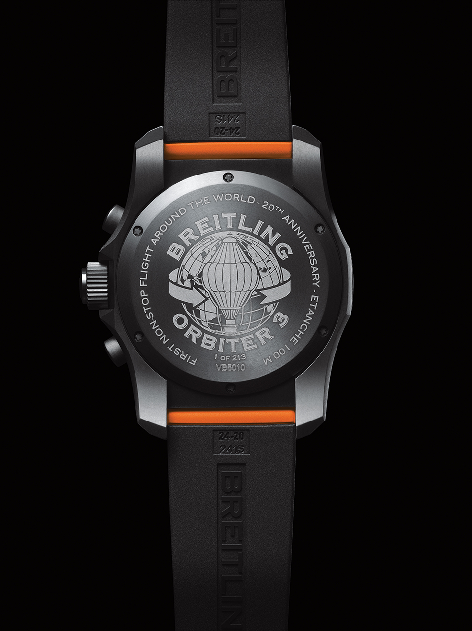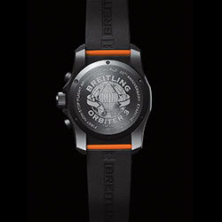Выразительная задняя крышка корпуса выполнена из титана и крепится при помощи винтов. Кроме того, она украшена изображением аэростата и земного шара, а также надписью BREITLING ORBITER 3. По периметру часов нанесена надпись – First non-stop flight around the world – 20TH anniversary – ETANCHE 100 M и указан индивидуальный номер (1 OF 213).