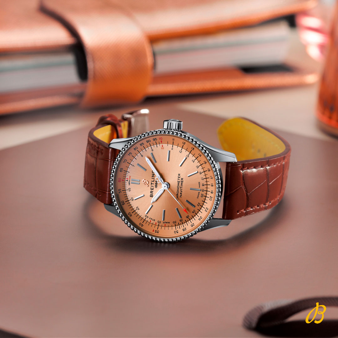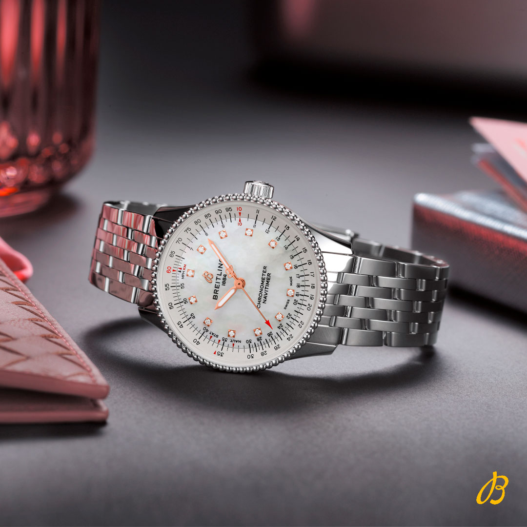 Компания Breitling также предлагает биколорные Navitimer Automatic 35 с корпусом из нержавеющей стали диаметром 35 мм и роскошным, вращающимся в оба направления безелем из 18-каратного розового золота. Циферблат из белого перламутра декорирован бриллиантовыми часовыми метками. Ремешок из кожи аллигатора коричневого цвета оснащен классической или раскладной застежкой. Кроме того, часы доступны с биколорным браслетом Navitimer из нержавеющей стали и 18-каратного розового золота с раскладной застежкой.