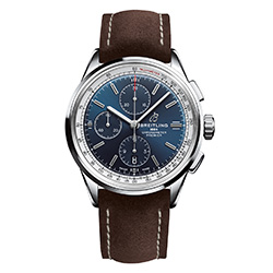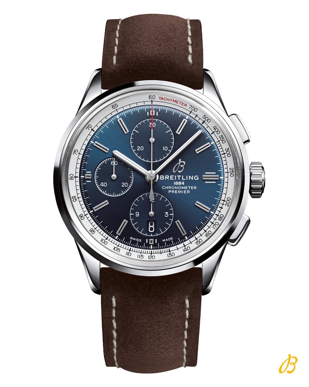 Модели линейки Premier B01 Chronograph 42, оснащенные мануфактурным калибром Breitling Manufacture Caliber 01, являются флагманами новой коллекции. Практика подтвердила, что калибр Breitling Caliber 01, разработанный полностью специалистами компании Breitling, является одним из самых эффективных часовых механизмов в мире. Хронограф с автоподзаводом, сертифицированный Швейцарским институтом официального тестирования хронографов, обладает впечатляющим запасом хода свыше 70 часов. Модель Breitling Premier B01 Chronograph 42 выполнена в прочном корпусе из нержавеющей стали диаметром 42 миллиметра с прозрачной задней крышкой и поставляется в вариантах с синим или серебристым циферблатом. Версия с синим циферблатом предлагает на выбор либо синий ремешок из кожи аллигатора, либо коричневый ремешок из нубука с белой прострочкой, либо с браслетом из нержавеющей стали. Модель с серебристым циферблатом поставляется с черным ремешком из нубука или кожи аллигатора, либо с браслетом из нержавеющей стали.