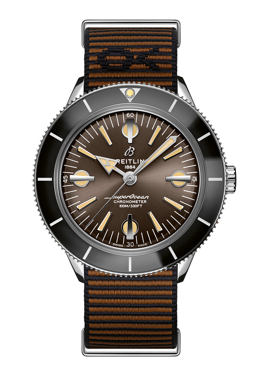 Часы Superocean Heritage ’57 Outerknown Limited Edition также обладают бронзовым циферблатом и коричневым ремешком NATO Outerknown из материала ECONYL®. Их вогнутый безель из 18-каратного розового золота, вращающийся в оба направления, эффектно смотрится на фоне черного керамического кольца. Эта модель выпущена ограниченным тиражом 500 экземпляров.