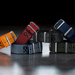 Часы можно приобрести с ремешком одной из шести цветовых комбинаций: синий с темно-синими полосками, голубой с темно-синими полосками, желтый с оранжевыми полосками, серый с черными полосками, красный с черными полосками и зеленый с черными полосками (с подкладкой во всех цветовых вариациях).