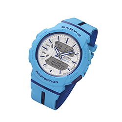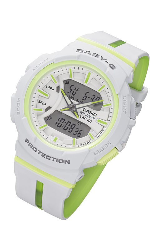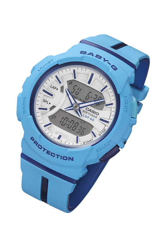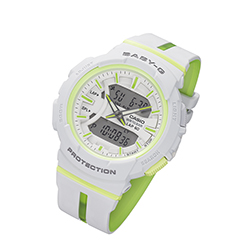 Разработанные специально для бега, японские часы BABY-G от Casio выполнены в спортивном стиле. Их яркая цветовая гамма отлично гармонирует со спортивной одеждой. Часы представлены в четырех цветовых решениях: BGA-240L-7A (белый – лаймово-зеленый), BGA-240L-1A (черный – оранжевый), BGA-240L-2A2 (небесно-голубой – синий), BGA-240L-2A1 (синий – розовый). Новые модели оснащены яркими двухцветными браслетами из полимерного материала. При этом на внешней части есть центральная и боковые вставки второго цвета, который присутствует во внутренней части браслета. Такие декоративные элементы еще больше усиливают спортивный характер моделей, как вокруг циферблата это делает и цветное кольцо.