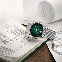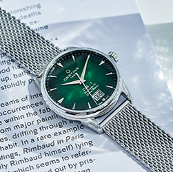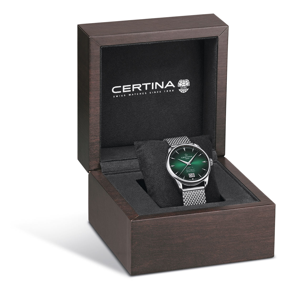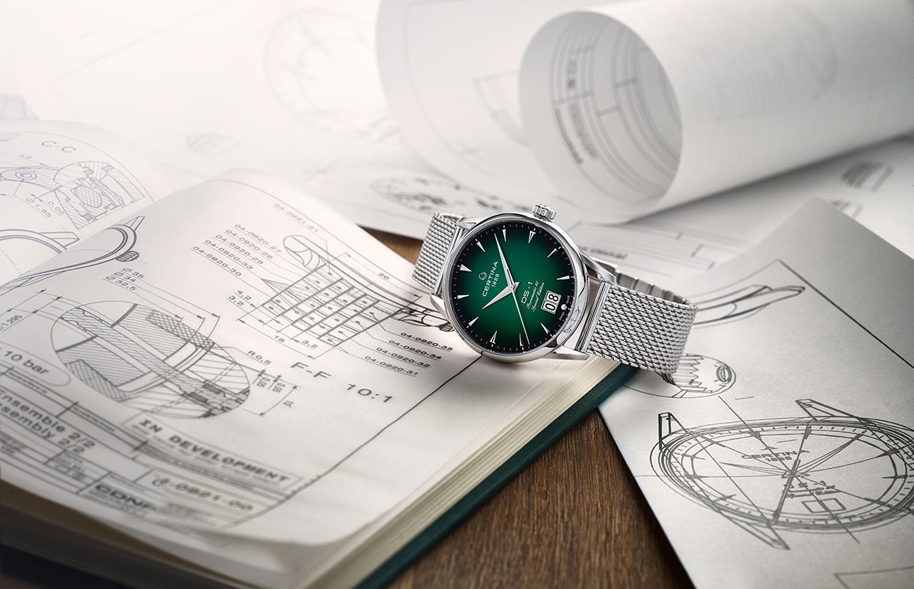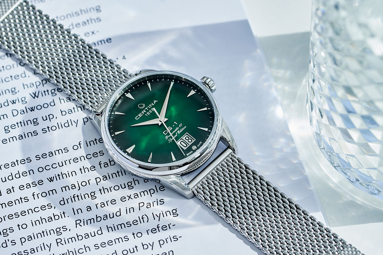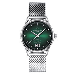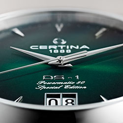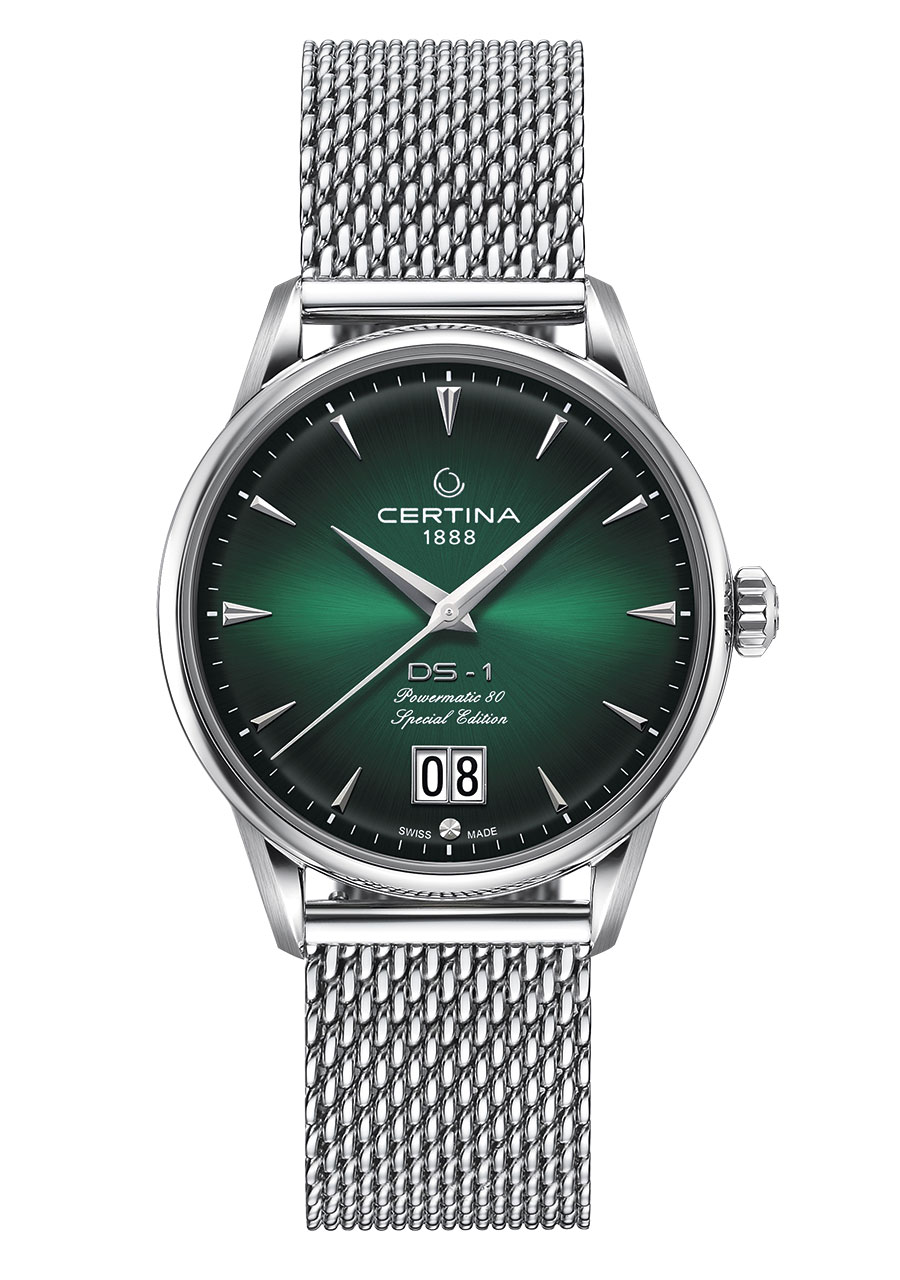 DS-1 Big Date 60th Anniversary – современная интерпретация своего знаменитого предшественника. Выпуклый циферблат имеет фирменный зеленый оттенок Certina. Градация цвета и гильоше «Солнечные лучи» подчеркивают его глубину и насыщенность. Большое окошко даты на отметке «6 часов», клиновидные часовые отметки с обработанными краями и удлиненные стрелки обеспечивают оптимальную считываемость. Задняя крышка корпуса диаметром 41 мм дополнена памятным оттиском в честь 60-летнего юбилея. Браслет с миланским плетением из нержавеющей стали завершает элегантный образ. Часы представлены в специальной упаковке.
