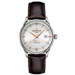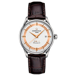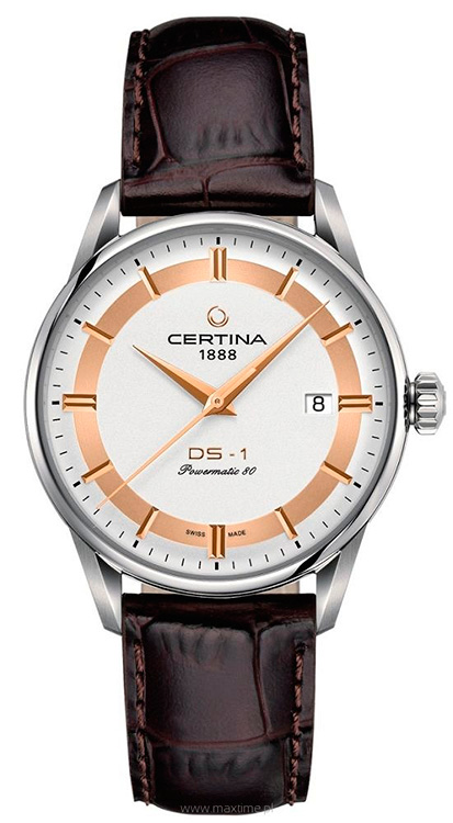 | 5. Certina DS-1 Powermatic 80 C029.807.16.031.01: корпус из нержавеющей стали, серебристый циферблат, стрелки и условные индексы с PVD-покрытием из розового золота, прозрачная задняя крышка, тёмно-коричневый кожаный ремешок. | |