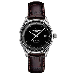 | 4. Certina DS-1 Powermatic 80 C029.807.16.051.00: корпус из нержавеющей стали, чёрный циферблат с никелированными стрелками и условными индексами, прозрачная задняя крышка, тёмно-коричневый кожаный ремешок. | |