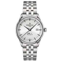 | 7. Certina DS-1 Powermatic 80 C029.807.11.031.00: корпус из нержавеющей стали, серебристый циферблат с никелированными стрелками и условными индексами, прозрачная задняя крышка, 5-рядный браслет из нержавеющей стали. | |