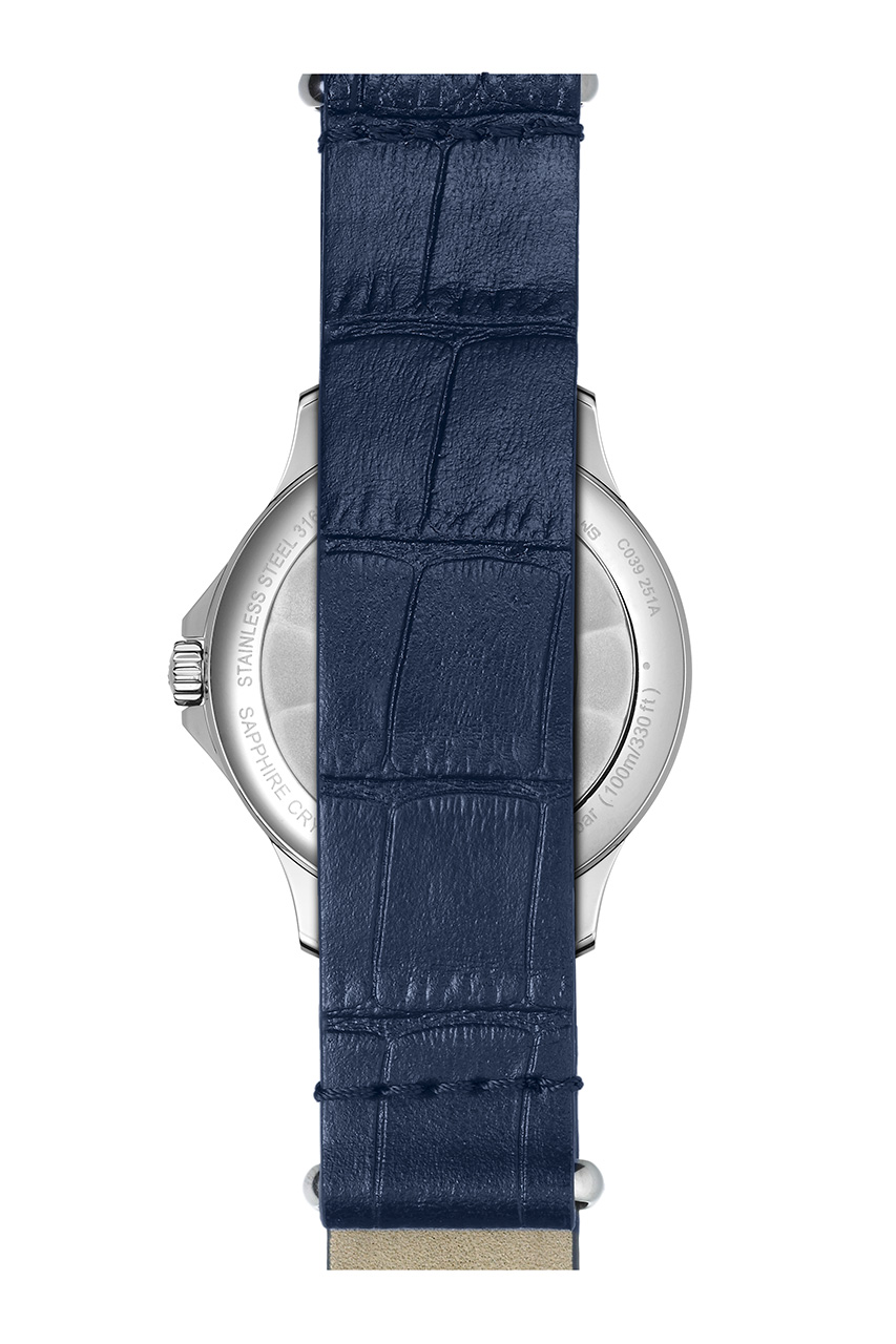 - C039.251.17.047.00 Белый безель, синий циферблат, ремешок из экологичного материала.