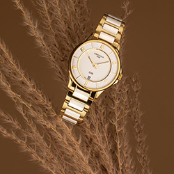 Ваше сердце будет биться чаще в любой день года благодаря классическому элегантному дизайну и теплому оттенку желтого золота модели DS-6 Lady. Корпус диаметром 35 мм из нержавеющей стали с PVD-покрытием с декоративной отделкой в виде сатинирования и полировки идеально располагается на запястье. Широкий безель расширяет белый или золотой циферблат модели. Шесть арабских цифр, утонченные стрелки и индексы, а также дата на отметке «6 часов» дополняют лаконичный дизайн. Часовая и минутная стрелки покрыты качественным люминесцентным составом Super-LumiNova®. Часы комплектуются браслетом из нержавеющей стали с PVD-покрытием. Белые керамические звенья добавляют модные акценты двухцветной версии модели.