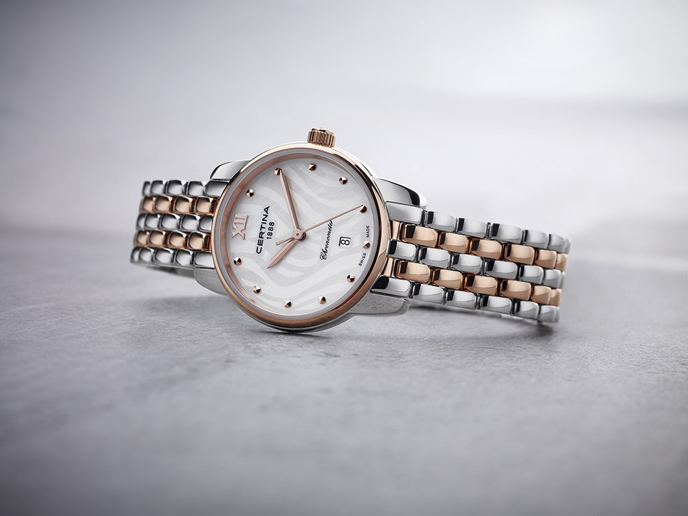 Новая женская модель DS-8 Lady от Certina представлена в изысканном корпусе из нержавеющей стали диаметром 27,5 мм с PVD-покрытием цвета розового золота. Элегантный дизайн дополняют стрелки, часовые отметки и двухцветный металлический браслет из пяти рядов полированных звеньев. Белый перламутровый циферблат служит идеальным холстом для стильного декора из тонких округлых линий.