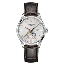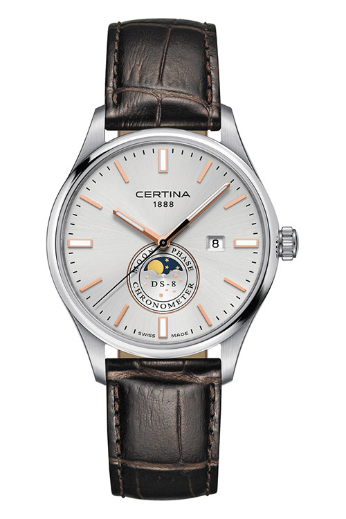 Мужские часы DS-8 Moon Phase от Certina выполнены в корпусе из нержавеющей стали диаметром 41 мм с чередованием матовых и полированных поверхностей. Серебристый циферблат с гильоше «солнечные лучи» создает прекрасный фон для указателя фазы Луны на отметке «6 часов». Он подобен сияющему лунному диску, который совершает свой путь по темно-синему звездному небосклону. Впечатление усиливают стрелки и часовые отметки с напылением из розового золота. Благодаря покрытию SuperLumiNova показания легко считываются в темноте или при свете молодой Луны. Завершают ансамбль сапфировое стекло с антибликовым покрытием и коричневый кожаный ремешок с тиснением под крокодиловую кожу. Данная модель представлена и в других вариантах исполнения.