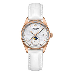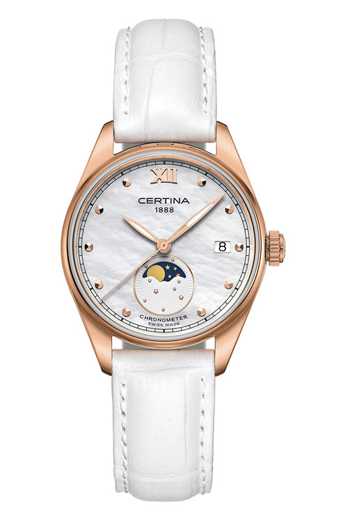 Часы DS-8 Lady Moon Phase представляют собой истинно женственную версию. Элегантный корпус модели из нержавеющей стали диаметром 32,5 мм дополнен PVD-покрытием из розового золота. Белый перламутровый циферблат, а также сияющие стрелки и часовые отметки с напылением из розового золота представляют собой роскошное обрамление для указателя фазы Луны на отметке «6 часов». Он позволяет наблюдать искрящийся небесный свод и за пределами белого окошка этого указателя, украшенного гильоше «солнечные лучи» и нежным декором в виде крошечных звезд. Часы оснащены белым кожаным ремешком с тиснением под крокодиловую кожу. Женские модели также исполнены в других цветах и материалах.