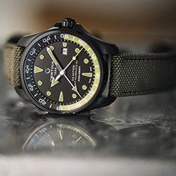 Корпус диаметром 43 мм из нержавеющей стали с черным PVD-покрытием скрывает автоматический калибр Powermatic-80 с запасом хода до 80 часов. Стрелки и часовые отметки с покрытием Super-LumiNova® зеленого цвета четко различимы на матовом черном циферблате даже в темноте. Отдельная стрелка и 24-часовая шкала позволяют легко считывать показания времени второго часового пояса. Спортивный характер и надежную конструкцию часов подчеркивает текстильный ремешок цвета хаки с классической застежкой. Также доступны варианты исполнения в черном корпусе с PVD-покрытием, с акцентами коричневого цвета и кожаным ремешком, либо стальным браслетом, а также с черным циферблатом с зелеными или красными акцентами.