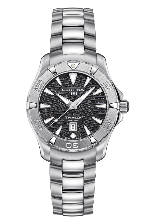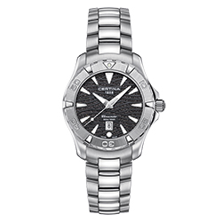 Диаметр стального корпуса составляет 34,3 мм – идеальный размер для изящного женского запястья. Корпус выполнен с чередованием полированных поверхностей и поверхностей с крацеванием. Завинчивающаяся задняя крышка декорирована исторической эмблемой марки CERTINA – панцирем черепахи. А завинчивающаяся заводная головка имеет дополнительную защиту. Стрелки и часовые отметки с люминесцентным покрытием Super-LumiNova®, а также удобный в обращении однонаправленно вращающийся безель делают часы CERTINA DS Action Lady идеальной моделью для занятий водными видами спорта. Известная система двойной защиты DS (Double Security) собственной разработки гарантирует исключительную стойкость, водонепроницаемость и безупречное функционирование на протяжении многих лет.