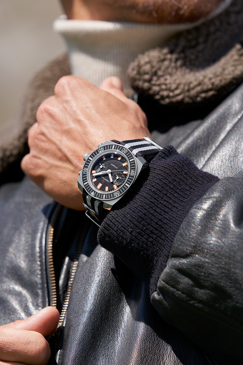 Эти часы, прототипом которых служит модель DS Chronograph Automatic 1968 года, носят легендарное имя. В конце 60-х годов часы DS Argonaut произвели фурор своим эффектным корпусом и потрясающе надежной сборкой. Вдохновившись легендарной моделью прошлых лет, швейцарские часовые мастера создали достойного преемника, который я прекрасно впишется в любую героическую сагу. Модель DS Chronograph Automatic 1968 имеет стальной корпус в форме подушки (43,5 x 43,5 мм) и покрыт черным PVD. Сапфировое стекло спереди и на задней крышке обеспечивает оптимальный обзор деталей и отличную считываемость показаний. Круглое сапфировое кольцо с черно-белой шкалой придает визуальную глубину однонаправленно вращающемуся безелю. А благодаря покрытию Super-LumiNova® скошенные под острым углом стрелки и часовые индексы четко выделяются на фоне черного циферблата даже в темноте.