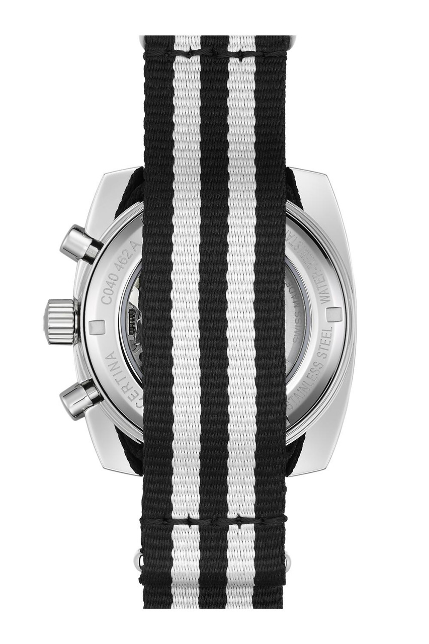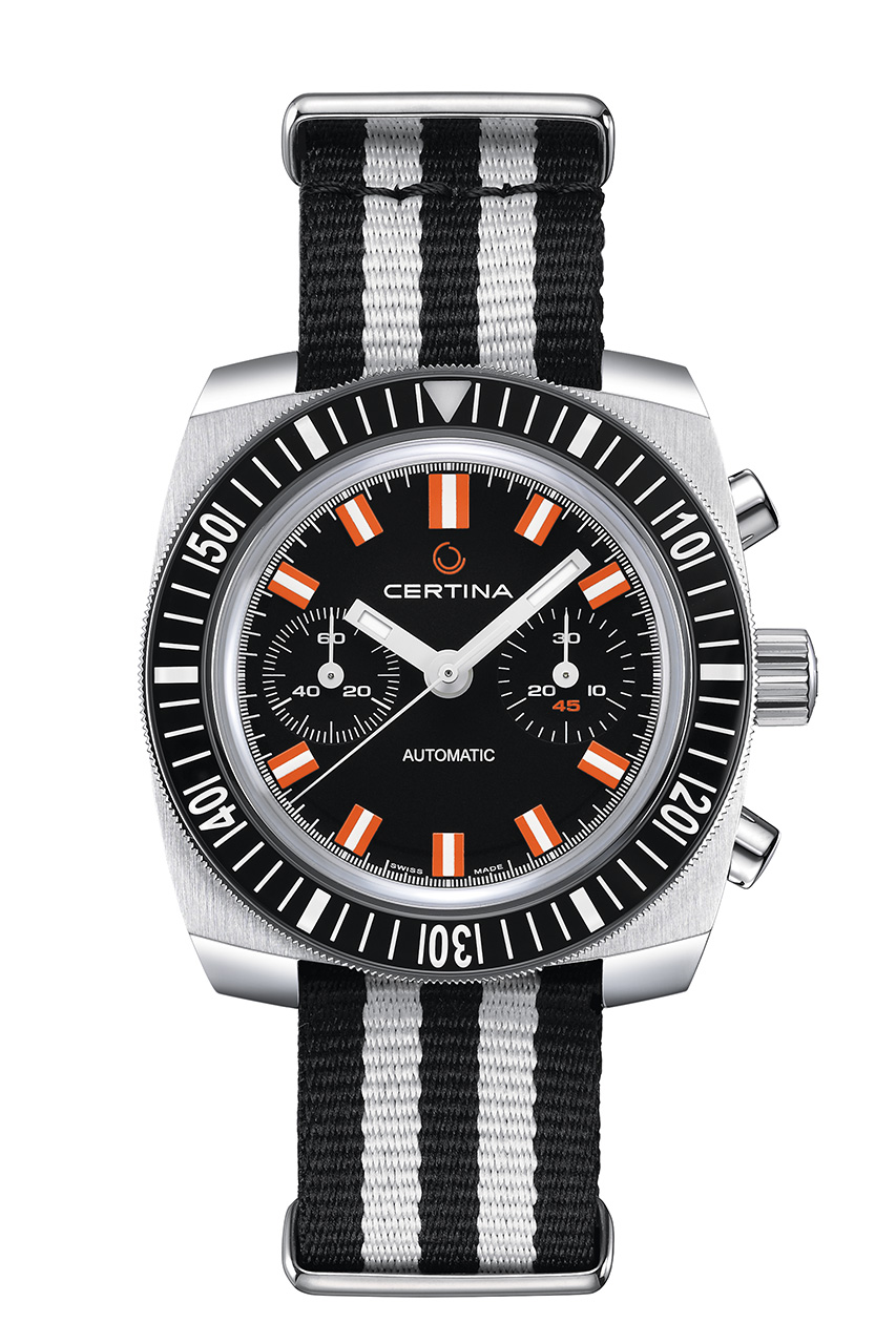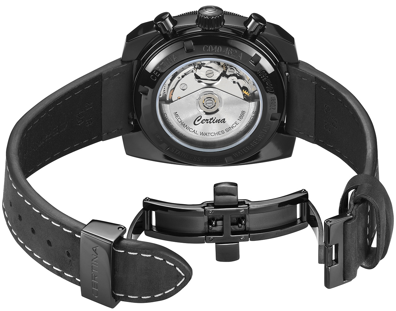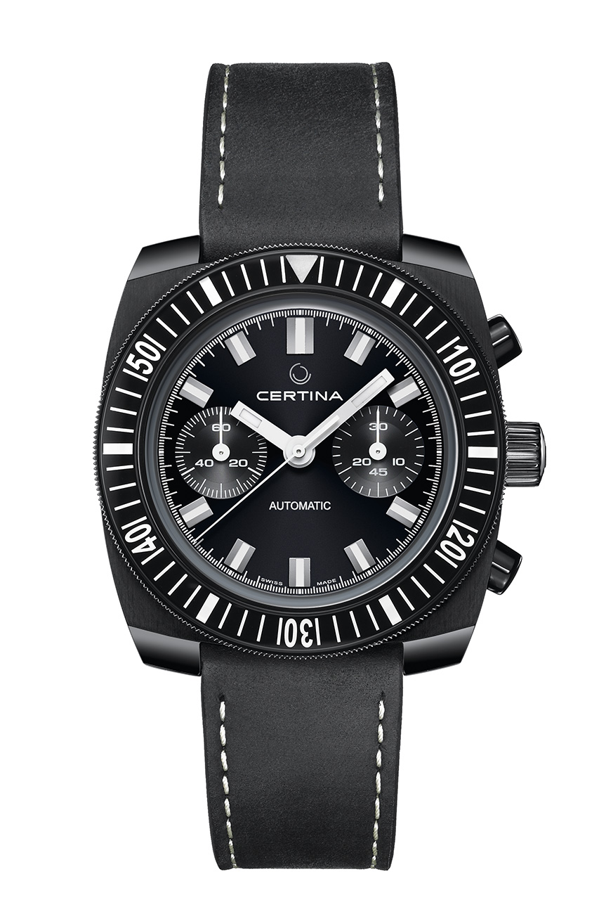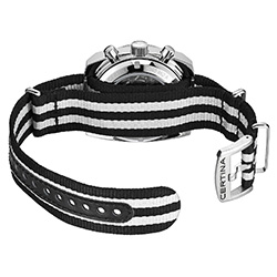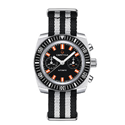 Элегантный винтажный стиль – лишь одна из многих граней нового хронографа DS Chronograph Automatic 1968. Другой аспект – его спортивный характер, подчеркнутый 30-минутным счетчиком на отметке «3 часа» и дополненный центральной секундной стрелкой и малой секундной стрелкой на отметке «9 часов». Эффектная завинчивающаяся заводная головка и водонепроницаемость до 20 бар (200 м) являются залогом повышенной надежности. Матовый черный кожаный ремешок с белой строчкой, который легко поменять благодаря системе быстрой замены Certina, обеспечивает дополнительную безопасность и комфорт. Наряду с черной версией также доступна версия из нержавеющей стали с оранжевыми акцентами на циферблате и NATO-ремешком в черно-белую полоску, изготовленным из переработанного материала #tide ocean®.