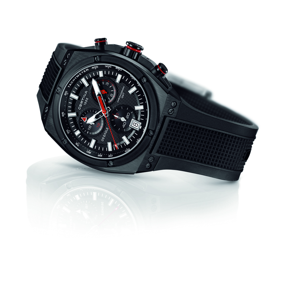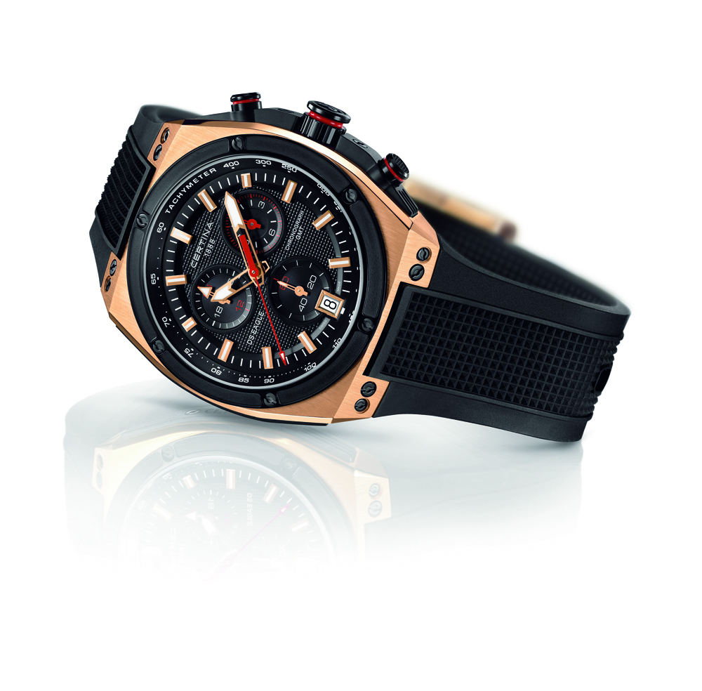 Элитные часы «Certina DS Eagle Chronograph GMT» выделяются необычным дизайном, смелым техническим решением и представлены в нескольких вариантах цветового оформления корпуса: контрастное сочетание стали и чёрного PVD-покрытия; корпус с отделкой PVD-покрытием чёрного цвета, комбинация чёрного PVD-покрытия и PVD-покрытия из розового золота.