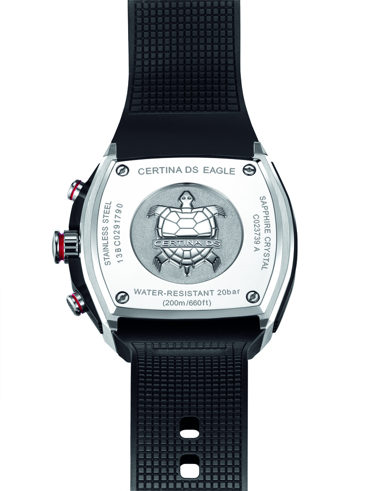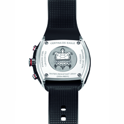 Корпус новых часов, диаметром 46 мм, выполнен из сатинированной нержавеющей стали марки «316L» и имеет контрастную матовую полированную поверхность. Он оснащён укреплённым на шести болтах чёрным массивным безелем с вставками из углеродного волокна, а также завинчивающейся заводной головки с монограммой «DS» и двумя кнопками хронографа. Все три последние детали украшены красными декоративными поясками. Тыльная сторона корпуса закрыта завинчивающейся задней крышкой с изображением символа марки – черепахи. Корпус снабжён боковыми, укреплёнными на болтах скобами, которые не только обрамляют корпус, но и являются предохранительным, защитным элементом для кнопок и заводной головки. Хронограф «Certina DS Eagle GMT» оборудован швейцарским кварцевым механизмом «ETA G10.961» с функцией 24-часового указателя времени второго часового пояса.
