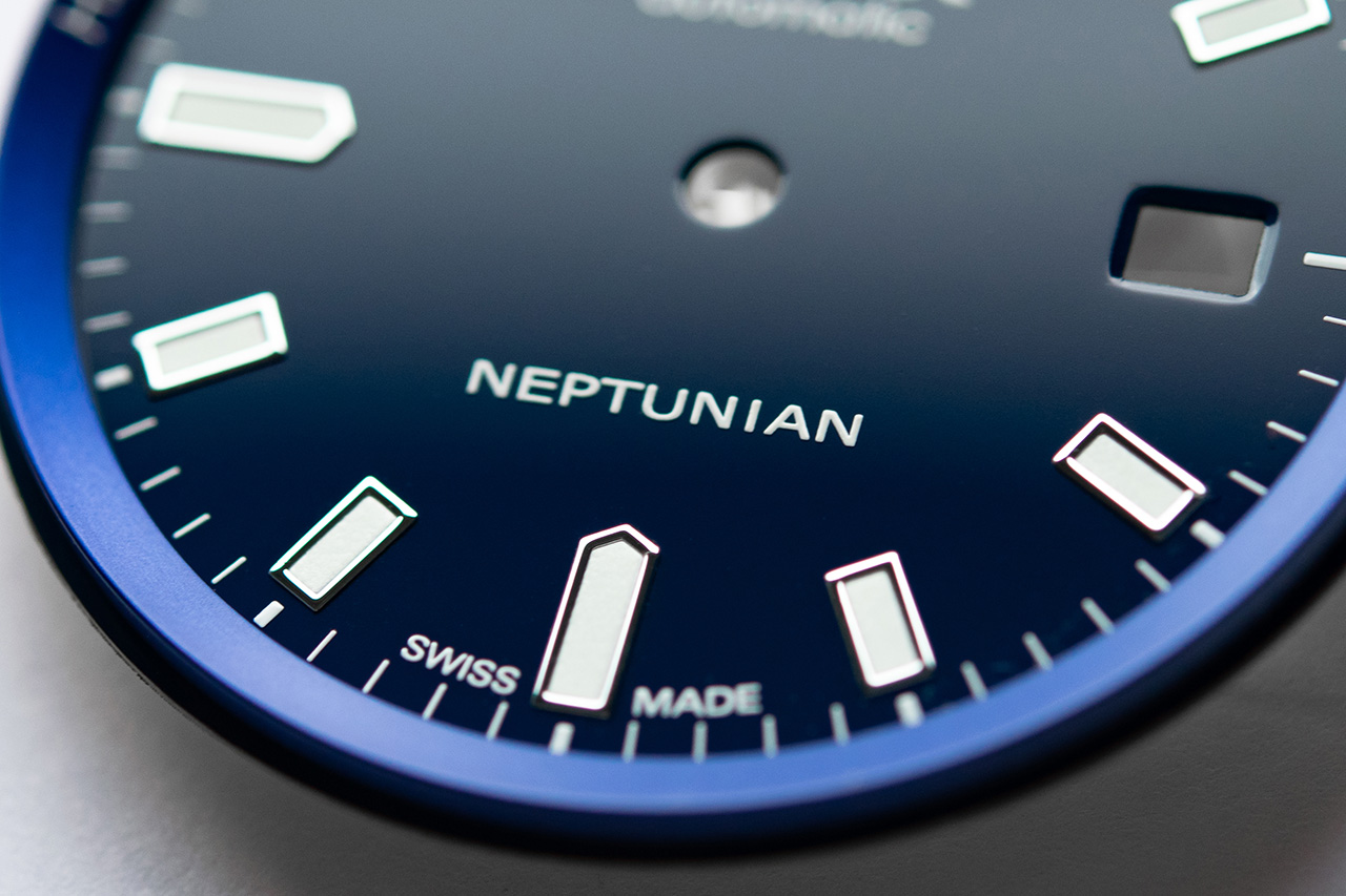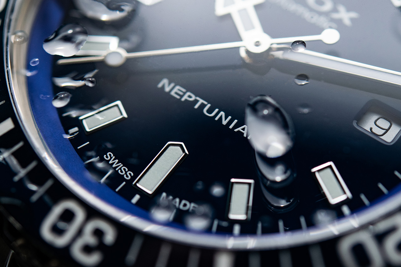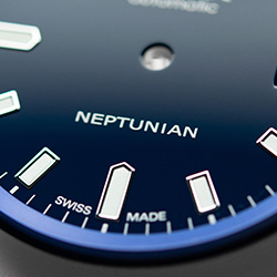 Вы никогда не пропустите морской пейзаж благодаря темно-синему циферблату, который напоминает о цветах океана и его необъятности. Стрелки и индексы Neptunian с покрытием Super-LumiNova X1 обеспечивают читаемость при слабом освещении или под водой. Встроенный гелиевый выпускной клапан гарантирует, что автоматический механизм Neptunian Calibre 80 с 38-часовым запасом хода не пропустит ни одного удара, даже находясь глубоко под волнами.