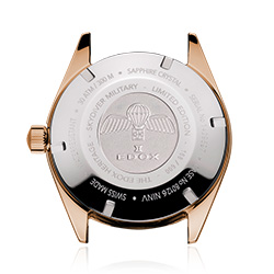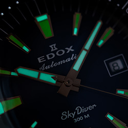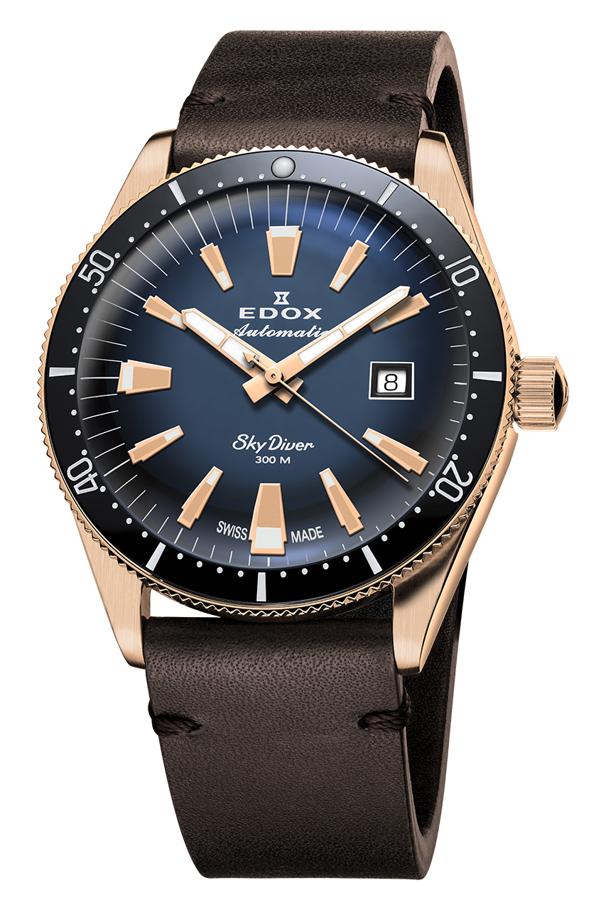 Часы SkyDiver XXI века теперь являются основой семейства часов Edox и сочетают лучшее из обоих миров – классический дизайн с совершенно современным оттенком. Теперь Edox представляет новый SkyDiver с уникальной «изюминкой» – бронзовый корпус с розовым покрытием Bronze Date Automatic. Розовые оттенки бронзового корпуса прекрасно дополняются элегантным шиферно-серо-голубым циферблатом. Часы SkyDiver Bronze Date Automatic излучают классическую атмосферу винтажных часов, но при этом они по-прежнему прочны – прямо как суровый, оригинальный парашютист в военной тематике. Большие индексы и стрелки с покрытием Super-LumiNova напоминают простые для чтения циферблаты военных часов, а внешний керамический безель, устойчивый к царапинам, также является практичным инструментом для дайверов с давлением до 30 АТМ.