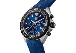 TAG Heuer Formula 1 Chronograph создан под влиянием мира гонок и скорости. Синий циферблат с тремя счётчиками и красными акцентами подчёркивает динамичный характер модели, а чёрный тахиметрический безель усиливает спортивный образ.
